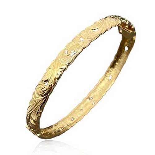 14KT Gold Hawaiian 8mm Cut-Out Plumeria Scrolled Bangle with Box Clasp and Hinge