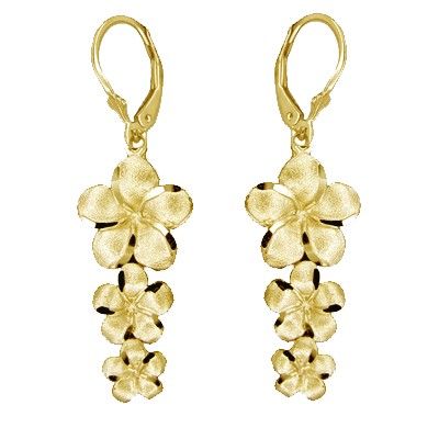 Hawaiian Island Style Earrings in 14KT Yellow Gold. Handmade jewelry with the flavors of the Hawaiian islands, elements of the sea and mixed culture of the islands. Popular styles include Plumeria flower, Sea Turtle (Honu), pineapple, whale tail, dolphin, ray, palm tree, Hibiscus (state flower), bird of paradise, slipper, wave, fish hook and more. Each gold Earrings come with Lifetime warranty and free shipping.