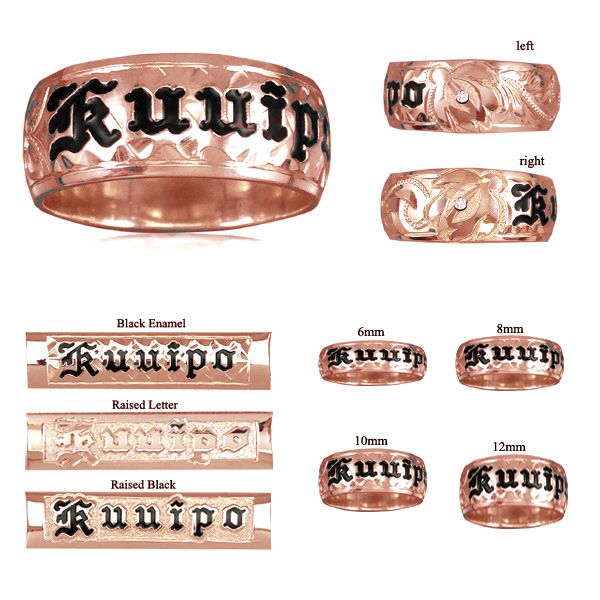 14K Rose Gold Custom Hawaiian Ring with Diamond Turtles. There is a 0.03ct diamonds set in the center of each turtle. Hand carved in Hawaii with Aloha. 1.25mm in thickness. We will engrave up to 10 letters on the ring.
