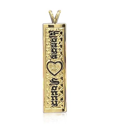 14K Yellow Gold Custom Hawaiian Vertical Pendant with Engraved Black Enamel Heart between the tow names. 1.25mm in thickness. You may have up to 6 letters on each name.