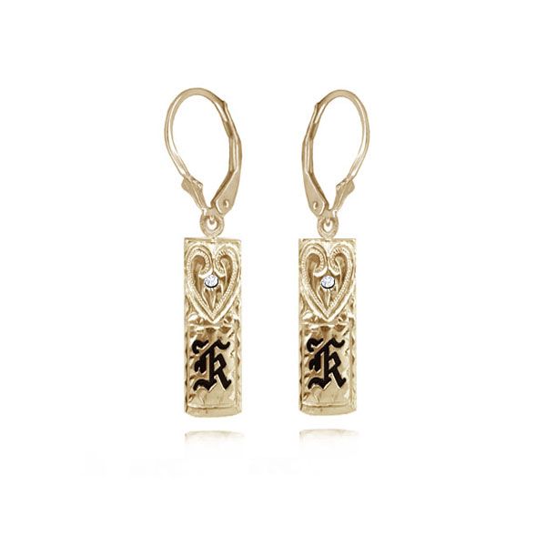 14K Yellow Gold Hawaiian Initial Lever Back Earrings with Diamond Heart