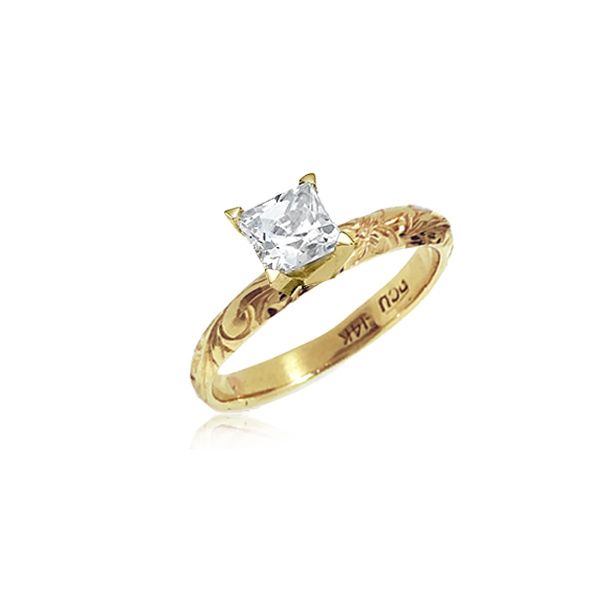 14KT Gold Hawaiian Engagement Ring with Princess shape Cubic Zirconia. Available in 6mm stone. The stone is set on 3mm ring band with hand carved Hawaiian Plumeria scroll design.