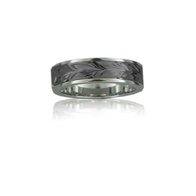Maile Hawaii Brand - Sterling Silver Hawaiian Black Rhodium Two Tone Maile 6mm Ring Band. 6mm in width and 2mm in thickness with hand carved Maile leaves designs all around the ring. Available in size 5 to 10. This ring is finished with Rhodium to avoid tarnishing.