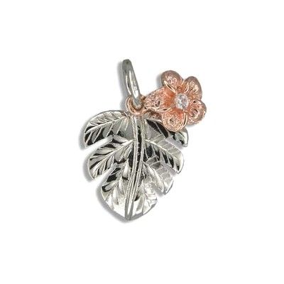 Hand Engraved Fine Sterling Silver Monstera leave and Plumeria flower pendant. The 1" Monstera leave is engraved with Hawaiian Maile design and the Plumeria flower has a clear CZ stone in the center and finished with 14kt Rose Gold plating. The Monstera is coated with Rhodium to avoid tarnishing.