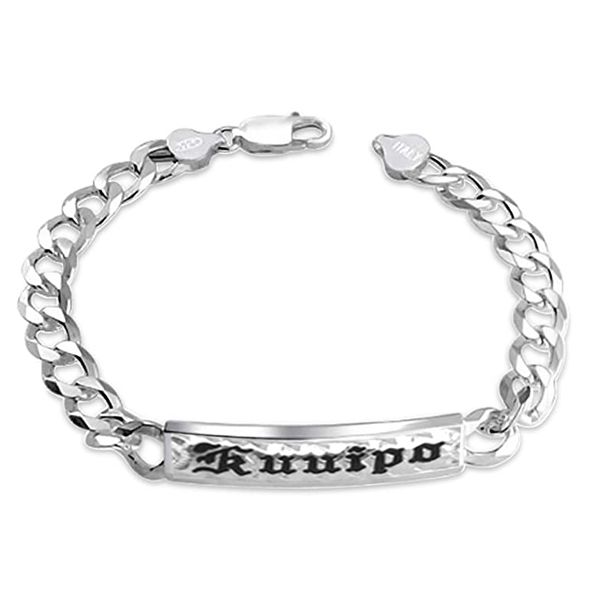 Sterling Silver Curb Link ID Bracelet with Custom Name. Available in 7-9 inches. Up to 7 letters Only. 8mm (5/16 inces) in width.