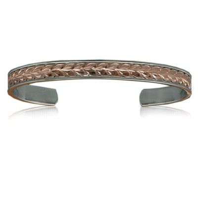 Sterling Silver Hawaiian 14K Yellow Two Tone Maile Cuff 8mm Bangle