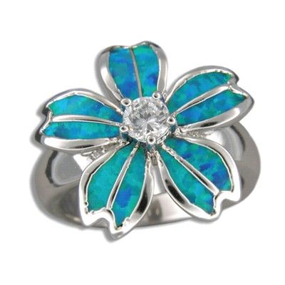 Sterling Silver Hawaiian Blue Opal Plumeria Pendant with CZ. 3/4" in diameter with inlay ocean blue opal on each petals and a 1 ct. CZ in the center.