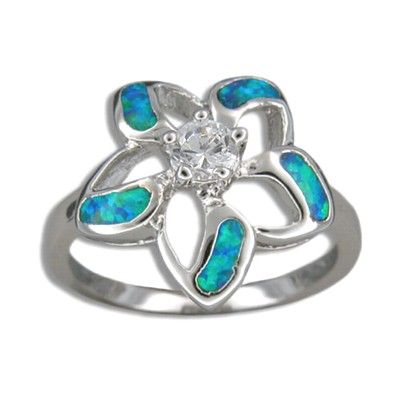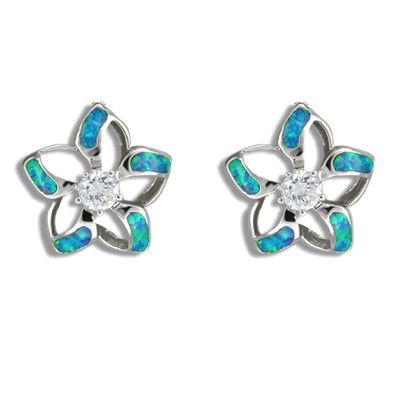 Sterling Silver Hawaiian Cut-in Blue Opal Fancy Plumeria Pierced Earrings with CZ. 5/8" in diameter with inlay ocean blue opal on each petals and a 1/2 ct. CZ in the center. These earrings are made with sterling silver and finished with Rhodium to avoid tarnishing