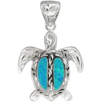 Sterling Silver Hawaiian Hand Carved Blue Opal Honu Pendant (L). This pendant is 1 1/16" in width and 1 3/8" in length with inlay Opal on the back of the sea turtle. Total length is 1 1/2". This pendant is made with sterling silver and finished with Rhodium to avoid tarnishing.