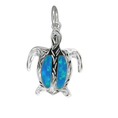 Sterling Silver Hawaiian Hand Carved Blue Opal Honu pendant. This pendant is 5/8" by 3/4" with inlay Opal on the back of the sea turtle. This pendant is made with sterling silver and finished with Rhodium to avoid tarnishing