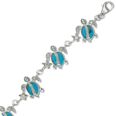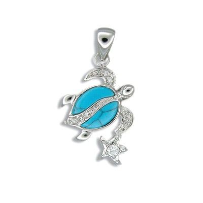 Sterling Silver Hawaiian Honu and Star Blue Turquoise Earrings with CZ. 1 1/4" by 1/2" with blue turquoise Inlay. The Honu is 1/2" in diameter with 2 hand polished inlay Blue Turquoise stones. In addition, there is a CZ set in the center of the Star. These earrings are made with sterling silver and finished with Rhodium to avoid tarnishing.