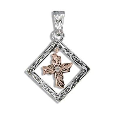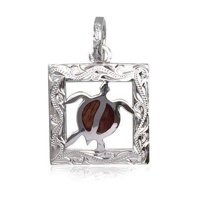 Sterling Silver Hawaiian Koa Wood Engraved HONU in Square Pendant. 7/8" in diameter and 1 5/16" in total length. This Honu in Square with Hawaiian Koa Wood Inlay pendant is made with sterling silver and finished with Rhodium to avoid tarnishing.