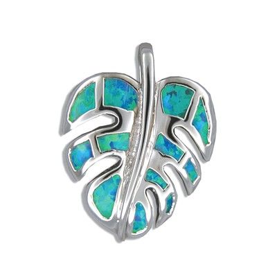 Sterling Silver Hawaiian Monstera Leaf Opal Pendant. 1" by 1" with Ocean Blue Opal Inlay. This pendant is made with sterling silver and finished with Rhodium to avoid tarnishing.