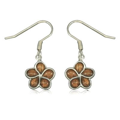 Sterling Silver Pink Opal Hawaiian Plumeria Fish Wire Earrings. Flowers are 1/2" by 1/2" with Pink Opal Inlay. Total length of the earrings included the fish wire is 1 1/4".