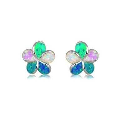 Sterling Silver Pink Opal Plumeria Pierced Earrings. 3/8" by 3/8" with Pink Opal Inlay. These earrings are made with sterling silver and finished with matching 14kt Rose Gold to avoid tarnishing.
