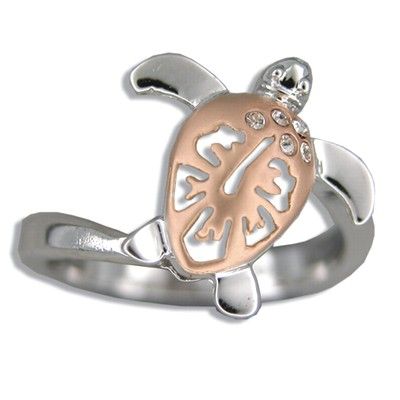 Sterling Silver Hawaiian Sea turtle Ring with Hibiscus flower. The 5/8" x 5/8" sea turtle has 14kt rose gold sand finish with CZ on the shell. Size 5 to 10 are available.