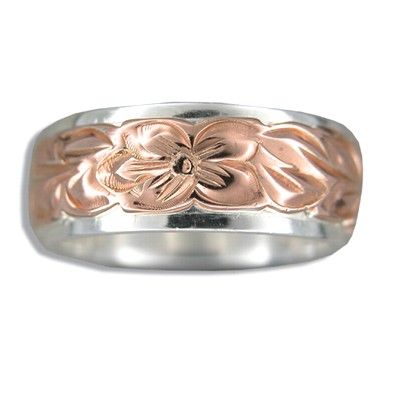 Sterling Silver Two Tone Hawaiian Plumeria and Maile Ring. There are two layers on the ring. The top layer is hand carved with Plumeria and Maile design and finish with 14kt rose gold coating. The bottom layer is 5/16" width and high polished plain band. This is a medium to heavy weight solid sterling silver ring and weighted about 9.6 grams. Ring Size 4-12 are available.