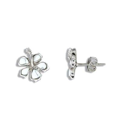 Sterling Silver Hawaiian Hibiscus Fish Wire Earrings with White Turquoise Inlay. Each Hibiscus Flower is 1/2 inches in diameter with 5 hand polished inlay White Turquoise stones. Total length is 1 1/4 inches.