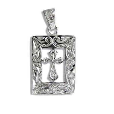 Fine Engraved Sterling Silver Men's Double Hawaiian Cross Pendant. The Cross shaped pendant is 7/8" in width, 1 1/4" in length and engraved with Hawaiian Scroll design. Always appropriate and gorgeous, this pendant is a timeless classic, and it belongs in every jewelry wardrobe. The pendant is coated with Rhodium to avoid tarnishing and total length is 1 1/2".