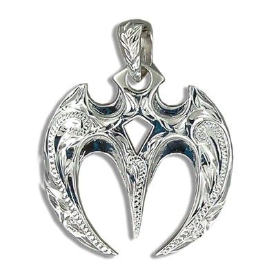 Fine Engraved Sterling Silver Men's Two Sided Hawaiian Batman Symbol Pendant. The Batman Symbol shaped pendant is 1 3/16" in diameter and engraved with Hawaiian Scroll design. Always appropriate and gorgeous, this pendant is a timeless classic, and it belongs in every jewelry wardrobe. The pendant is coated with Rhodium to avoid tarnishing and total length is 1 7/16".