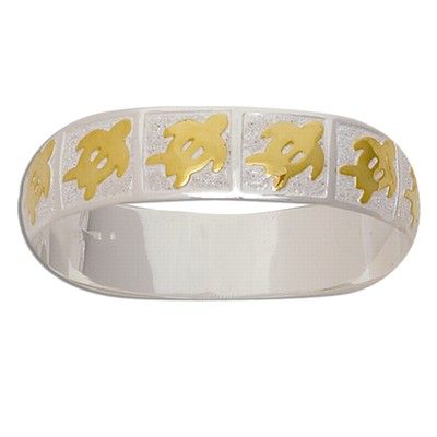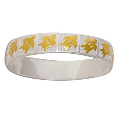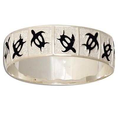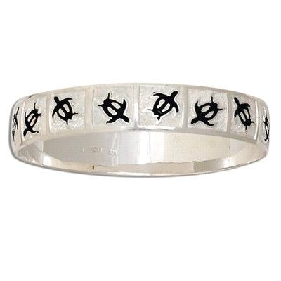 Sterling Silver 12mm Hawaiian Black Enamel HONU Design with Plain Edge Bangle. 1/2" in width and average over 20g in weight. There are Hawaiian HONU (sea turtle) designs with Black Enamel all around the bangle. The edges are plain design.
