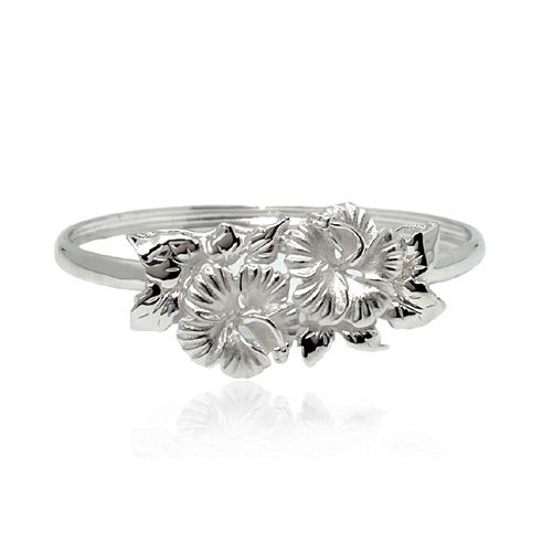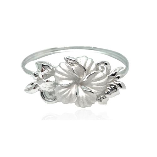 The Hawaiian Hibiscus Flower is 1/8" in diameter with brush finished and diamond cut on each petal. Size #4.5 to #10 are available.