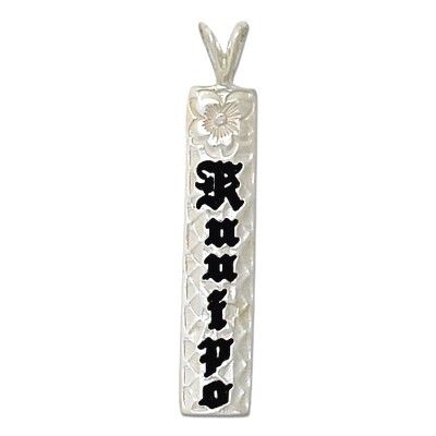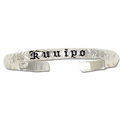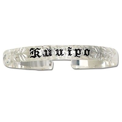 Sterling Silver 8MM Hawaiian Plumeria and Scroll Ring with Black Enamel "Kuuipo" . The 8mm ring is made with sterling silver and high polished to avoid tarnishing. There is a Black Enamel Name "Kuuipo" engraved on the center of the ring and the edge is Cut-Out design. Ring size 4-12 are available.