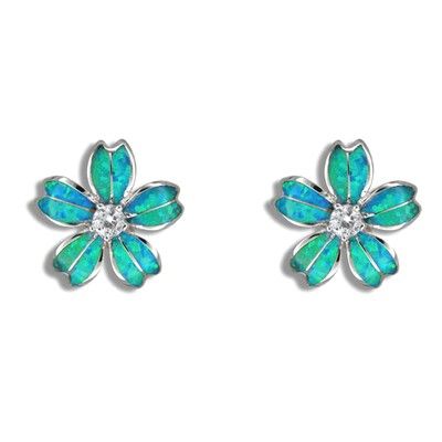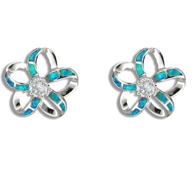 Sterling Silver Hawaiian Cut-in Blue Opal Plumeria Pierced Earrings with CZ. 5/8" in diameter with inlay ocean blue opal on each petals and a 1/2 ct. CZ in the center. This ring is made with sterling silver and finished with Rhodium to avoid tarnishing.