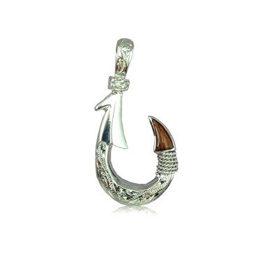 Sterling Silver Hawaiian Koa Wood Fish Hook with 2 Side Engraving Scroll Design Pendant (M)